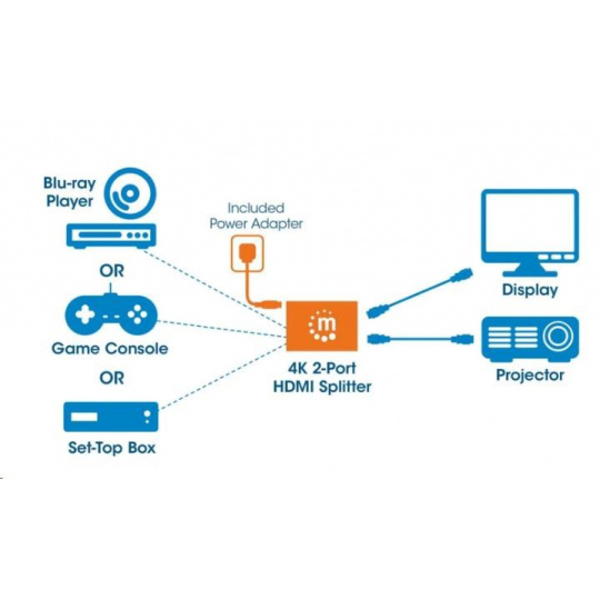 Manhattan 4K 2-portový rozdeľovač HDMI so zabudovaným zosilňovačom prenáša signál 4K HDMI z jedného zdroja UHD až na dva displeje UHD.