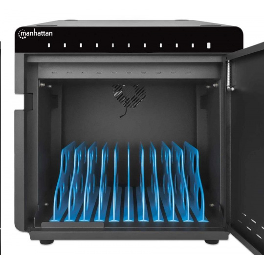 Stolná nabíjacia skrinka MANHATTAN - 10 portov, 180 W, prepäťová ochrana, tiché vetranie, kovový kryt, čierna