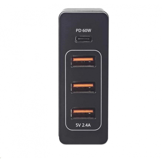 Jeden port USB-C Power Delivery s výkonom až 60 W, tri nabíjacie porty USB-A s výkonom až 12 W / 2.4 A, čierna