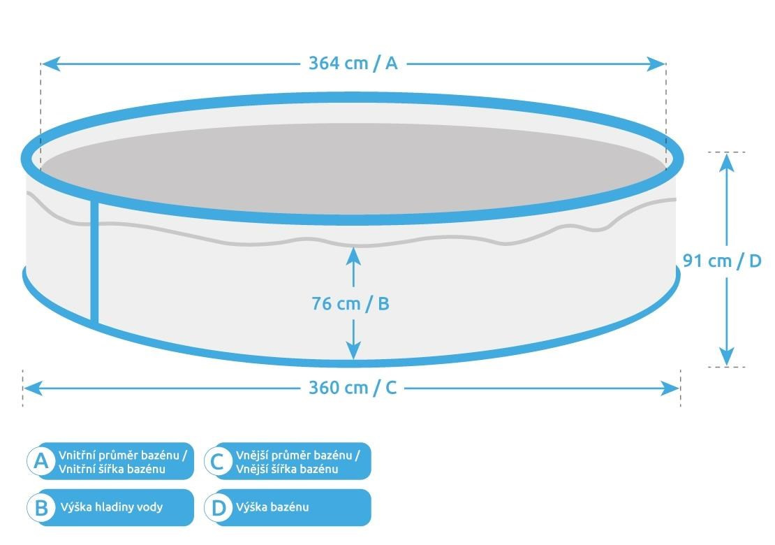 Uvedené rozmery bazéna sú iba orientačné a môžu ich ovplyvniť rovnosť podkladu alebo objem napustenej vody. Povolená výrobcná odchýlka je 5 %.