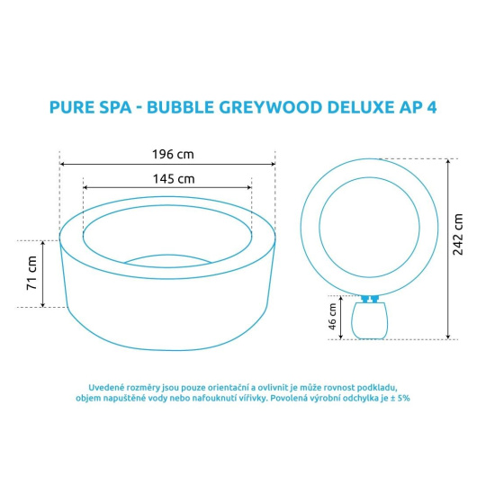 - Vonkajší priemer: 196 cm (po naplnení vodou, tolerancia ± 5%)