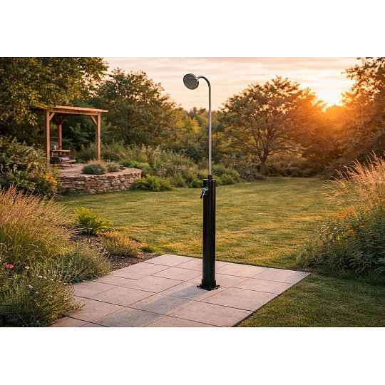 Zahradní dvoudílná a skladná sprcha DUO s objemem 10 l pro venkovní použití zajistí ohřev vody přiváděné ze zahradní hadice a tím perfektní pocit pohodlí při sprchování teplou nebo vlažnou vodou. Sprcha má pákovou baterii. Ohřev vody zajišťuje sluneční záření a tělo sprchy, které funguje jako solární kolektor. Pro sprchování musí být zahradní sprcha stále napojena na vodovodní řad. Není-li napojena, nelze se sprchovat. Sprcha se kotví pomocí 4 šroubů (nejsou součástí balení) pevně k zemi, čímž je zajištěna její perfektní stabilita.
