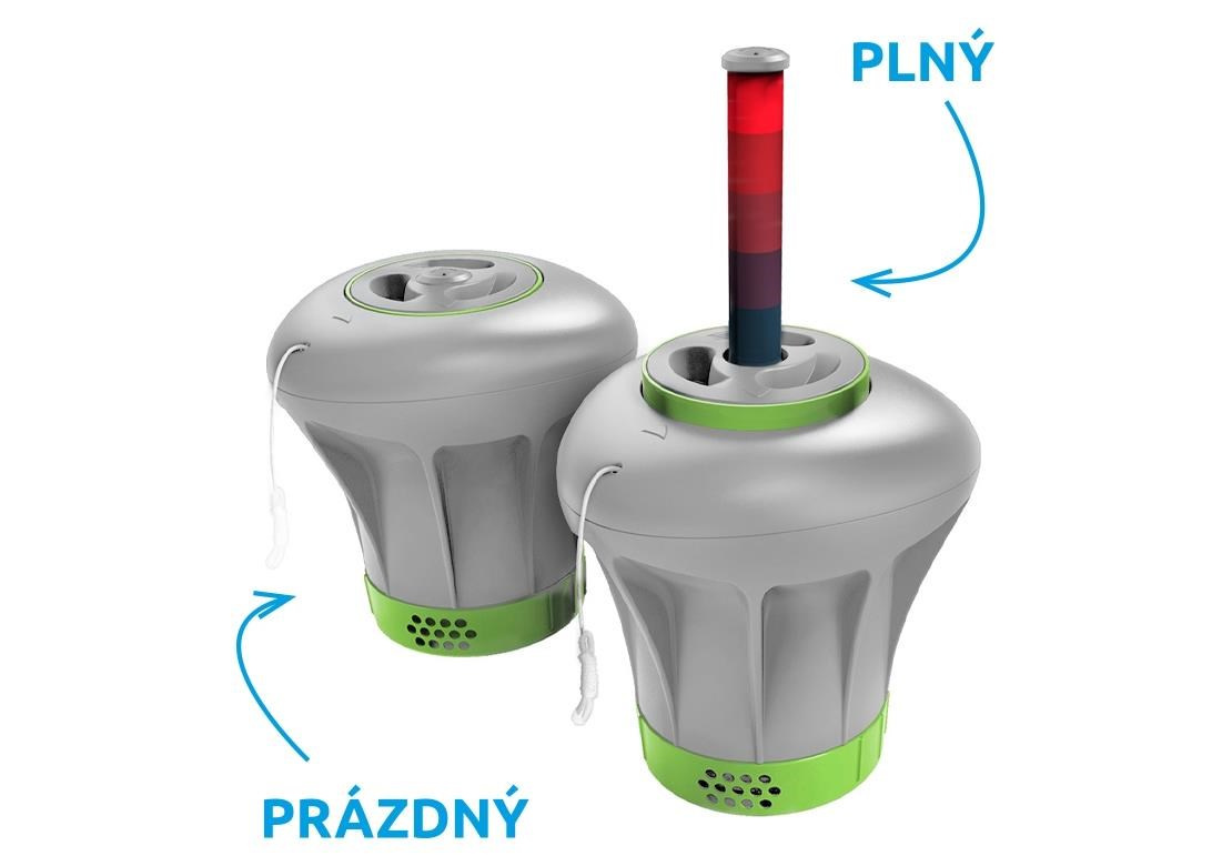 Veľký dávkovač chlóru má integrovaný farebný ukazovateľ, ktorý vás upozorní na potrebu doplniť nové tablety. Indikátor postupne klesá, keď sa chemikália rozpúšťa.