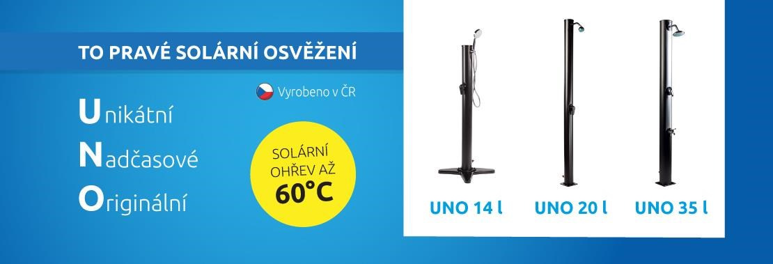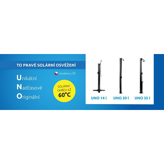 Prenosná solárna sprcha UNO 14 je plastová solárna sprcha s nádržou o objeme 14 litrov. Voda je zohrievaná slnečným žiarením v akumulačnej nádrži (telese). Pripojenie na vodovodný rad je veľmi jednoduché, sprchu možno pripojiť bežnou záhradnou hadicou cez hadicovú rýchlospojku. Záhradná sprcha so solárnym ohrevom je schopná ponúknuť teplú užitkovú vodu až po dvesto dní v roku. Vyrobená je z PP (Polypropylénu),