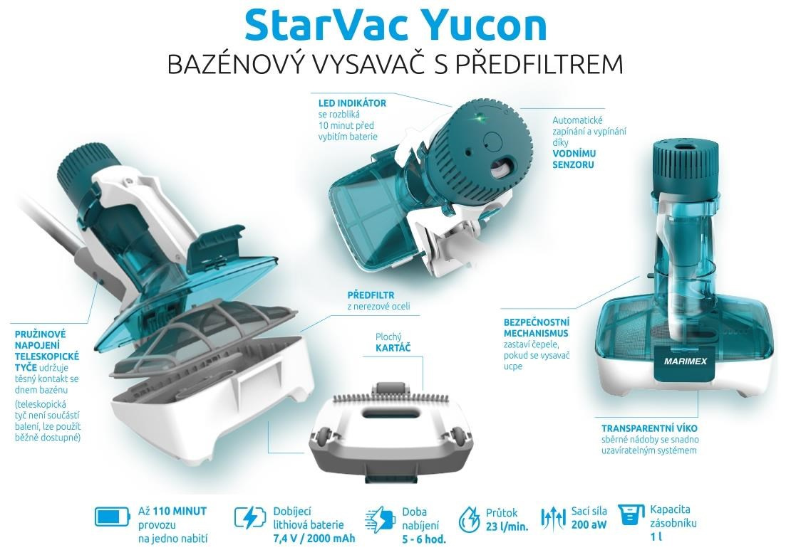 Bezdrôtový a prenosný bazénový vysavač Marimex StarVac Yucon je vhodný pre nadzemné aj zapustené bazény do priemeru 4,57 m. Vysavač disponuje automatickým zapínaním a vypínaním vďaka vodnému senzoru. Výhodou je aj LED indikátor, ktorý vás upozorní na vybitie batérie. Vysavač Yucon vydrží pracovať takmer 2 hodiny na jedno nabitie.