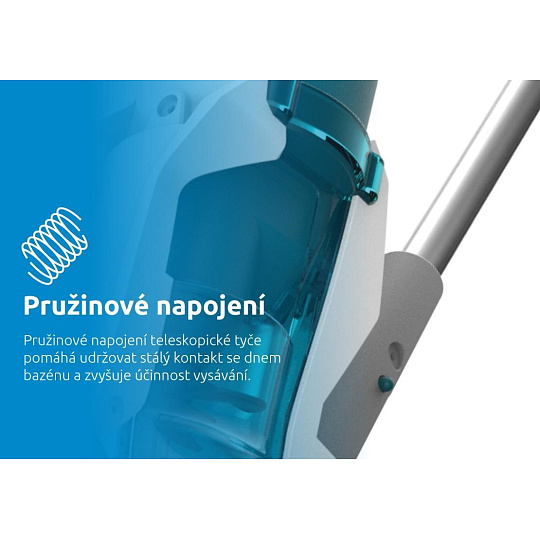 - pružinové napojenie teleskopickej tyče - udržiava tesný kontakt so dnom bazéna (teleskopická tyč nie je súčasťou balenia)