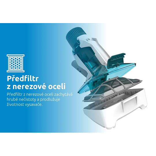 Vďaka transparentnému krytu zbernej nádoby máte vždy prehľad o stave naplnenia, zatiaľ čo plochá kefka na spodnej strane vysávača zabezpečuje efektívne čistenie. Predfiltrom z nerezovej ocele navyše zachytí hrubé nečistoty a predlžuje životnosť vysávača.