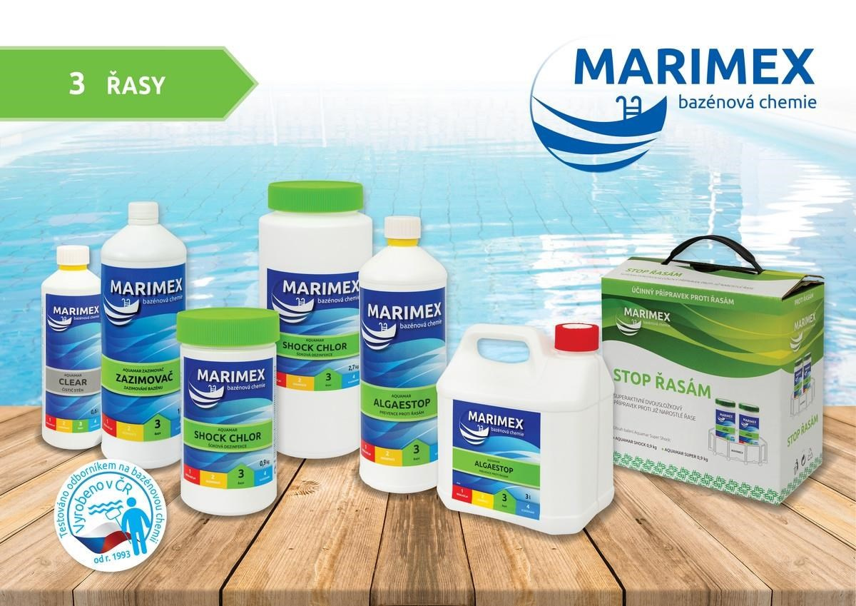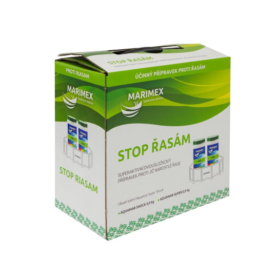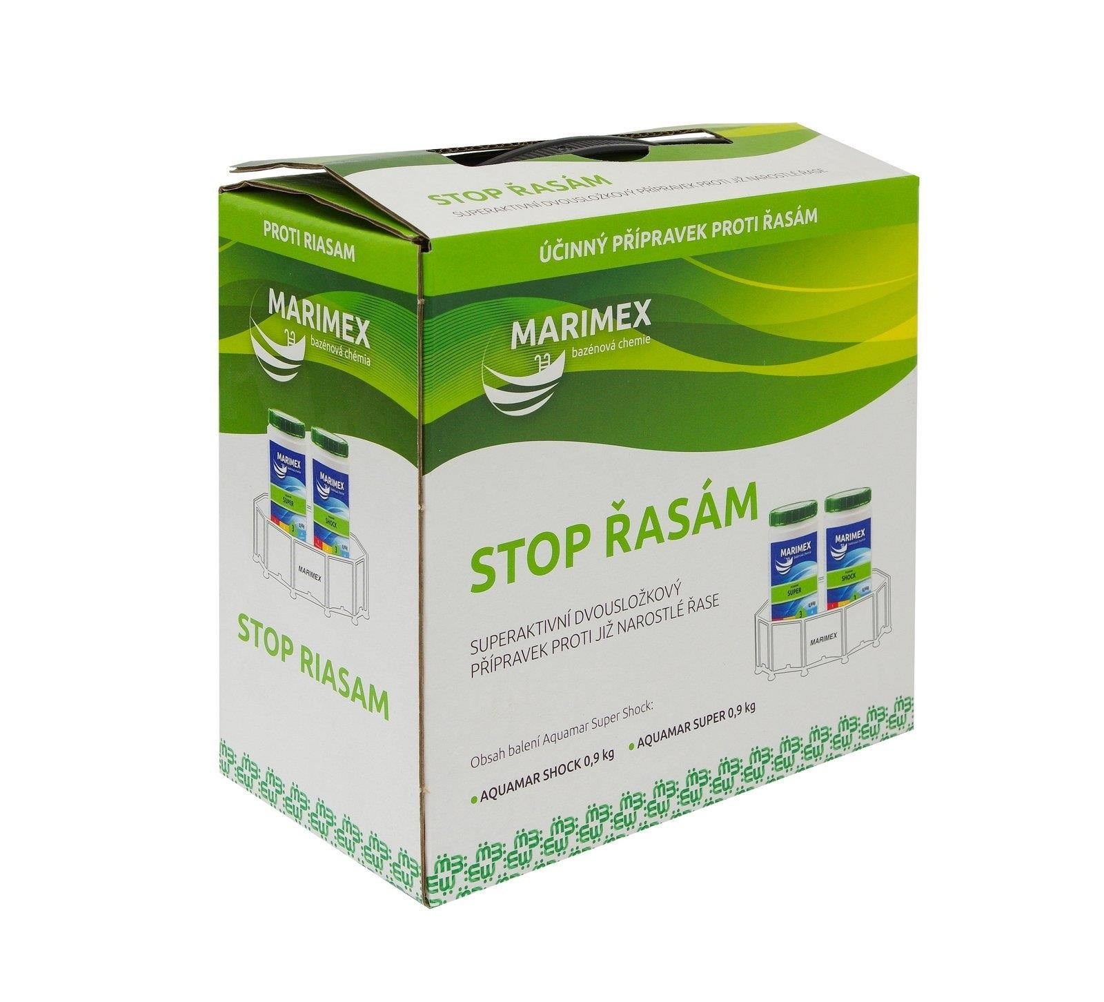 Marimex Super Chlor Šok je superaktívny dvojzložkový prostriedok proti už narastené rase. Tento prípravok odstráni aj čiernu rasu. Bublinky stúpajúce k hladine strhávajú a nabalujú rasy na seba a vynášajú ich s sebou na hladinu. Zneškodnené rasy z hladiny odstráni skimmer.