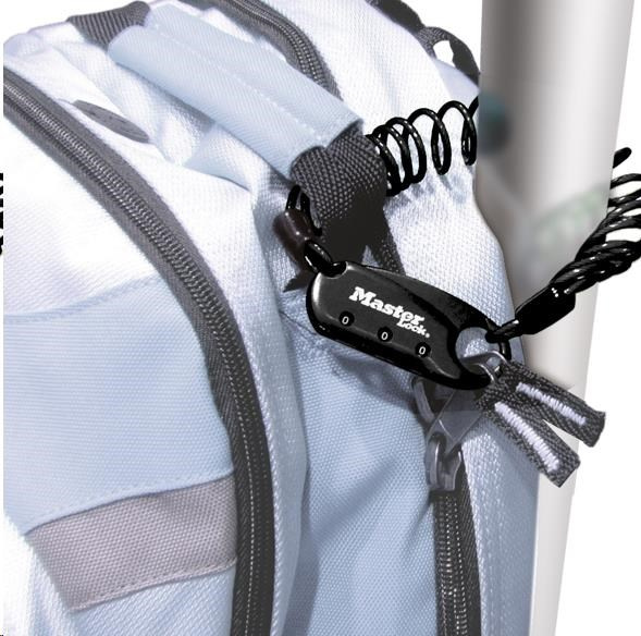 60 mm široká karabína s pevnou sťahovacou šnúrou dĺžky 90 cm. Jej konštrukcia z kovu je ľahká a ľahko prenosná. Kovová spona o priemere 3 mm je vhodná pre väčšinu zipsov. Obsahuje 3-miestny resetovateľný kombinovaný zámok. Odporúčame na ochranu batožiny, sedadiel a prilieb.