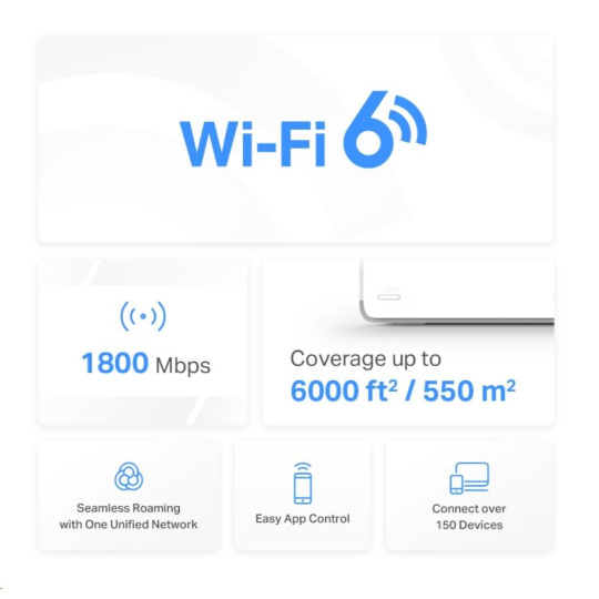 - Pokrytie celej domácnosti – pokrytie priestoru až 550 m2 (6 000 štvorcových stôp) vysokorýchlostnou sieťou Wi-Fi, ktorá eliminuje mŕtve zóny Wi-Fi pokrytia vo vašej domácnosti.