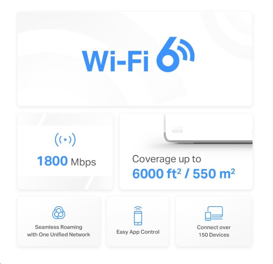 - Pokrytie celej domácnosti – pokrytie priestoru až 550 m2 (6 000 štvorcových stôp) vysokorýchlostnou sieťou Wi-Fi, ktorá eliminuje mŕtve zóny Wi-Fi pokrytia vo vašej domácnosti.