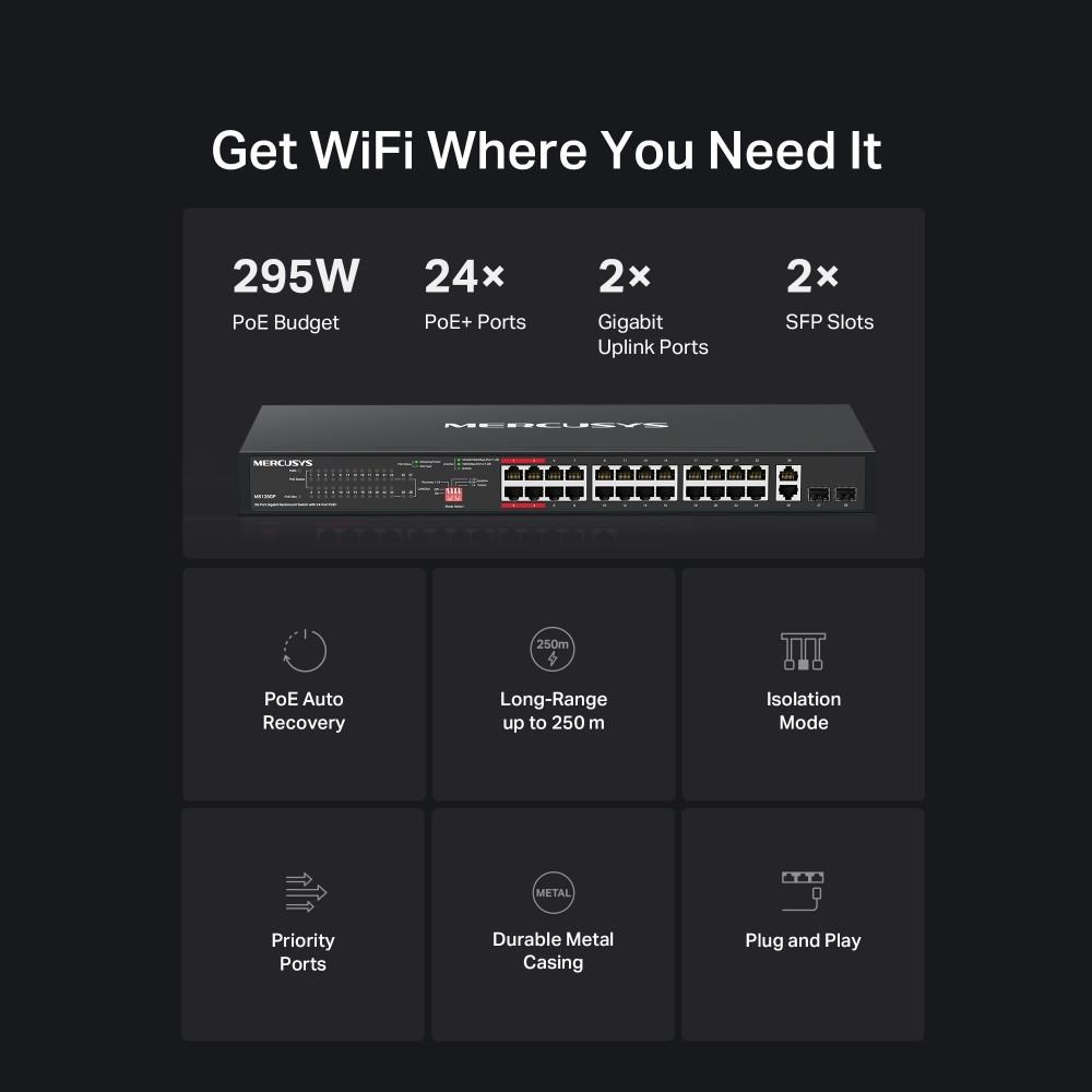 - Plně gigabitové porty: 24× Gigabitové PoE+ porty, 2× Gigabitové uplink porty a 2× Gigabitové SFP sloty