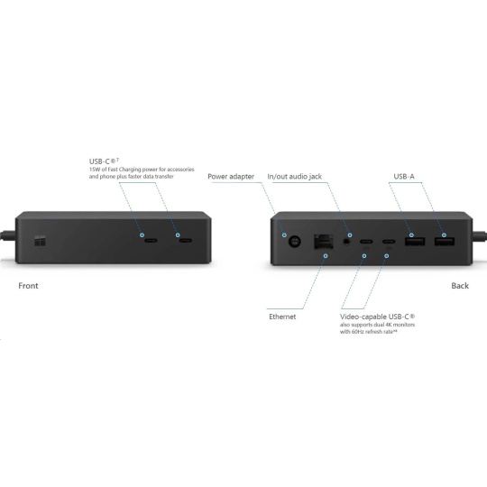 Originálna a inovatívna dokovacia stanica Microsoft Surface Dock 2 je špeciálne navrhnutá pre systém Windows 10 a zariadenia Microsoft Surface. Je vybavený 2 x USB 3.2 Gen 2 (vzadu, 7,5 W), 2 prednými USB 3.2 Gen 2 (15 W), 2 zadnými USB 3.2 Gen 2 (DP1.4a) (7,5 W), 3,5 mm audio vstupom/výstupom, gigabitovým Ethernetom a zámkom Kensington. Podporuje rozlíšenie až 2x 4K, bleskové nabíjanie smartfónu cez USB-C a umožňuje zásah správcu.