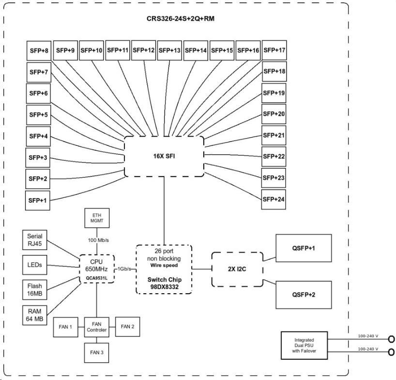 Prepínač má celkovo 2 porty QSFP+ a 24 portov SFP+, ktoré poskytujú celkovú priepustnosť 320 Gb/s a prepínaciu kapacitu 640 Gb/s s rýchlosťou presmerovania 252 Mpps pre najbežnejšie pakety.