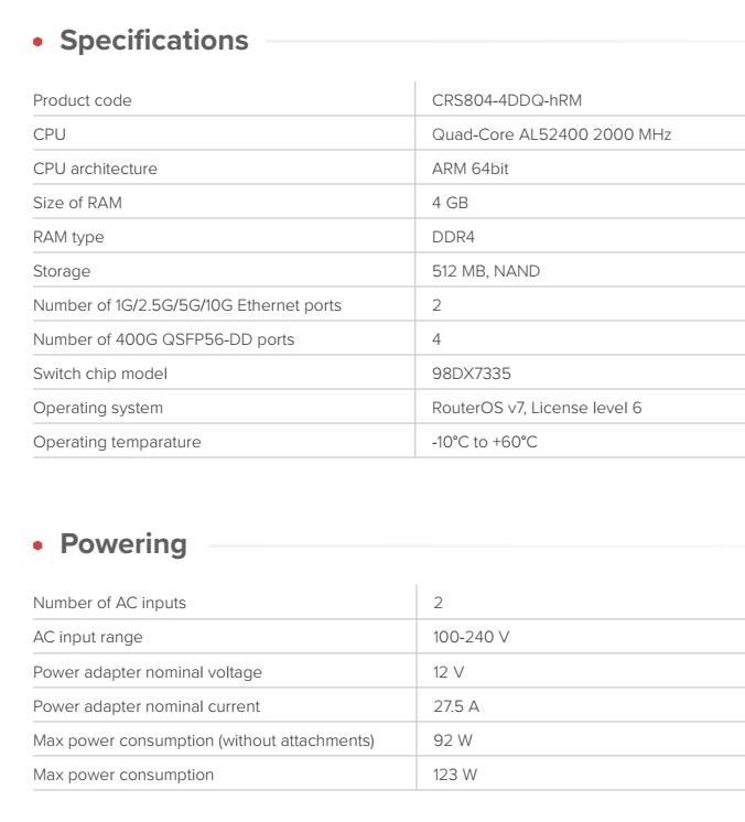 CRS804 DDQ je kompaktní a spolehlivý 400gigabitový přepínač navržený pro moderní AI pracovní zatížení a upgrade sítí nové generace. Se čtyřmi porty 400G QSFP-DD a duálním 1/10G Ethernetem poskytuje výjimečnou hustotu šířky pásma v tichém a efektivním formátu 1U. Uvnitř pracuje čip Marvell 98DX7335 společně s výkonným čtyřjádrovým procesorem ARM 2,0 GHz, 4 GB paměti DDR4 RAM a RouterOS v7. To poskytuje pokročilé řízení provozu a vysoký výpočetní výkon. CRS804 DDQ je navržen pro dlouhodobou spolehlivost a nízké pořizovací náklady, podporovaný hot-swap napájecími zdroji. Disponuje robustním chlazením a nízkou spotřebou energie, která dosahuje pouze 123 W při plném zatížení s nainstalovanou optikou. Případové studie Klastry AI a GPU Ideální stavební blok pro malé až střední instalace AI. Poskytuje předvídatelný výkon s nízkou latencí a přepínání s plnou rychlostí, čímž zajišťuje plynulý provoz uzlů GPU a datového toku bez úzkých hrdel. Díky kompaktnímu designu a nízké spotřebě energie je vhodný pro laboratoře AI, výzkumná prostředí a menší racková nasazení. All-flash úložné struktury Použijte nativní 400G porty pro rychlé úložné uplinky nebo je rozdělte na duální 200G linky. Ideální pro mediální produkci, vědecké úlohy a jakékoli prostředí, kde je nezbytný rychlý pohyb dat. Budoucnost pro stávající sítě CRS804 DDQ může fungovat jako vysokorychlostní jádrový nebo agregační přepínač i ve starších rackových skříních. Každý port 400G QSFP-DD je sestaven z osmi nezávislých datových linek. To umožňuje flexibilní možnosti rozdělení, včetně dvou 200G spojů pro AI pracovní zátěže nebo připojení s nižší rychlostí, jako je 100G nebo 40G. CRS804 DDQ můžete nasadit do své stávající sítě již dnes a postupně upgradovat na vyšší rychlosti, aniž byste museli přepínač vyměňovat. S vhodnými rozbočovacími kabely může CRS804 DDQ propojit prakticky jakékoli zařízení s porty SFP nebo QSFP, bez ohledu na generaci. Kompaktní 400G struktury v omezeném prostoru racku Vytvořte výkonnou páteřní nebo backbone strukturu pomocí čtyř 400G portů. Ideální pro malá datová centra, podnikové pody, instalace edge computingu a prostředí, kde by tradiční 400G zařízení byla příliš hlučná, příliš velká nebo příliš drahá. Technické specifikace Product code: CRS804-4DDQ-hRM CPU: Quad-Core AL52400 2000 MHz CPU architecture: ARM 64bit Size of RAM: 4 GB RAM type: DDR4 Storage: 512 MB, NAND Number of 1G/2.5G/5G/10G Ethernet ports: 2 Number of 400G QSFP56-DD ports: 4 Switch chip model: 98DX7335 Operating system: RouterOS v7, License level 6 Operating temparature: -10°C / +60°C Napájení Number of AC inputs: 2 AC input range: 100-240 V Power adapter nominal voltage: 12 V Power adapter nominal current: 27.5 A Max power consumption (without attachments): 92 W Max power consumption: 123 W Upozornění: Výrobce MIKROTIK nevztahuje záruku na zařízení poškozená přepětím. Zařízení je třeba na vstupech adekvátně chránit proti indukovanému elektrostatickému přepětí či přepěťovým špičkám na silovém vedení. Při venkovních instalacích je třeba používat stíněnou kabeláž (FTP/SFTP), příslušné přepěťové ochrany (pokud nejsou integrovány) a provést korektní a efektivní uzemnění. Zařízení vždy provozujte s poslední výrobcem publikovanou verzí (výrobcem označenou "Stable") operačního systému RouterOS. Taková verze garantuje nejoptimálnější funčknost, obsahuje opravené chyby z verzí předchozích a výkonová vylepšení..