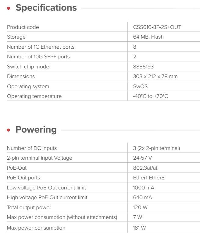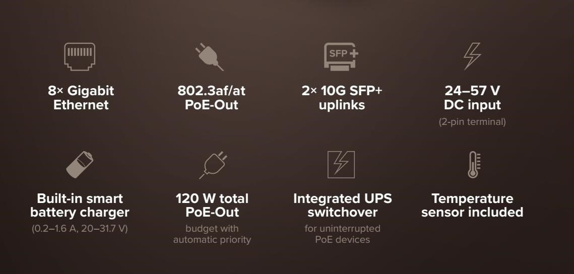 Kompaktní PoE switch s integrovanou UPS a inteligentní nabíječkou baterií – garance bezvýpadkového provozu CCTV kamer a přístupových bodů při výpadích napájení. Výpadky proudu by neměly znamenat prostoje. NetPower Lite 8P poskytuje spolehlivé napájení přes Ethernet i v případě výpadku elektrické sítě. Integrovaná UPS a inteligentní nabíječka spolupracují s vaší externí 24V baterií a mohou poskytovat vysokonapěťový výstup PoE i z nízkonapěťových zdrojů stejnosměrného proudu. netPower je tak ideální volbou pro CCTV, kanceláře, bytové domy a instalace v rámci inteligentních měst. NetPower Lite 8P je vybaven osmi gigabitovými ethernetovými porty s výstupem PoE 802.3af/at a dvěma 10G SFP+ uplinky pro vysokorychlostní backhaul. Používá systém SwOS Lite – rychlý, efektivní a příjemně jednoduchý na správu. SwOS je konfiguratelné z webového prohlížeče, vedle bežných funkcí řiditelných switchů umožňuje například • port-to-port forwarding management • apply MAC filter • configure VLANs • mirror traffic • apply bandwidth limitation • adjust some MAC and IP header fields Napájení je flexibilní, stačí připojit 24–57 V DC do 2-pinového terminálu. Stejně jako naše ostatní zařízení vhodná pro venkovní použití je i tento přepínač konstruován tak, aby vydržel. S provozním rozsahem od –40 °C do +70 °C funguje netPower Lite 8P i tam, kde by mnoho jiných zařízení již selhalo. Přepínač může odebírat až 181 W celkem, s rozpočtem 120 W PoE-Out. Pokud je příchozí výkon omezen, PoE je automaticky upřednostněno – nejprve se zpomalí nabíjení, aby vaše základní zařízení zůstala online. Integrovaná podpora UPS je efektivní, spolehlivá, nabízí různé možnosti : Připojte baterii s nominálním napětím 24 V – obvykle dvě 12V jednotky zapojené do série – a přepínač se okamžitě stane malým, efektivním UPS. Během výpadku napájení zůstávají zařízení PoE online bez jakýchkoli přerušení. Nabíječka podporuje zaplavené, AGM a gelové olověné baterie, stejně jako LiFePO4 (lithium-železo-fosfátové baterie) s příslušným BMS. Subsystém nabíječky je navržen pro nabíjení baterií přes 2pinový konektor v proudovém rozsahu 0,2–1,6 A a napěťovém rozsahu 20–31,7 V. Součástí je teplotní senzor, který jemně ladí napětí pro olověné baterie a blokuje nabíjení, když teploty překročí bezpečný rozsah. To pomáhá prodloužit životnost baterie. Podrobné technické specifikace: Product code: CSS610-8P-2S+OUT Storage: 64 MB, Flash Number of 1G Ethernet ports: 8 Number of 10G SFP+ ports: 2 Switch chip model: 88E6193 Dimensions: 303 x 212 x 78 mm Operating system: SwOS Operating temperature: -40°C to +70°C Napájení: Number of DC inputs: 3 (2x 2-pin terminal) 2-pin terminal input Voltage: 24-57 V PoE-Out: 802.3af/at PoE-Out ports: Ether1-Ether8 Low voltage PoE-Out current limit: 1000 mA High voltage PoE-Out current limit: 640 mA Total output power: 120 W Max power consumption (without attachments): 7 W Max power consumption: 181 W Upozornění: Výrobce MIKROTIK nevztahuje záruku na zařízení poškozená přepětím. Zařízení je třeba na vstupech adekvátně chránit proti indukovanému elektrostatickému přepětí či přepěťovým špičkám na silovém vedení. Při venkovních instalacích je třeba používat stíněnou kabeláž (FTP/SFTP), příslušné přepěťové ochrany (pokud nejsou integrovány) a provést korektní a efektivní uzemnění. Zařízení vždy provozujte s poslední výrobcem publikovanou verzí (výrobcem označenou "Stable") operačního systému RouterOS/SwOS. Taková verze garantuje nejoptimálnější funčknost, obsahuje opravené chyby z verzí předchozích a výkonová vylepšení. .
