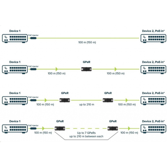 gPeR Gigabitový pasívny ethernetový opakovač umožňuje predĺžiť celkovú dĺžku kábla medzi začiatkom a koncom až na 1500 m! (pri použití 7 GPeR) Vhodné pre výškové budovy, viacbytové budovy s mnohými poschodiami a sekciami, kde by mohli byť veľmi dlhé ethernetové káble.