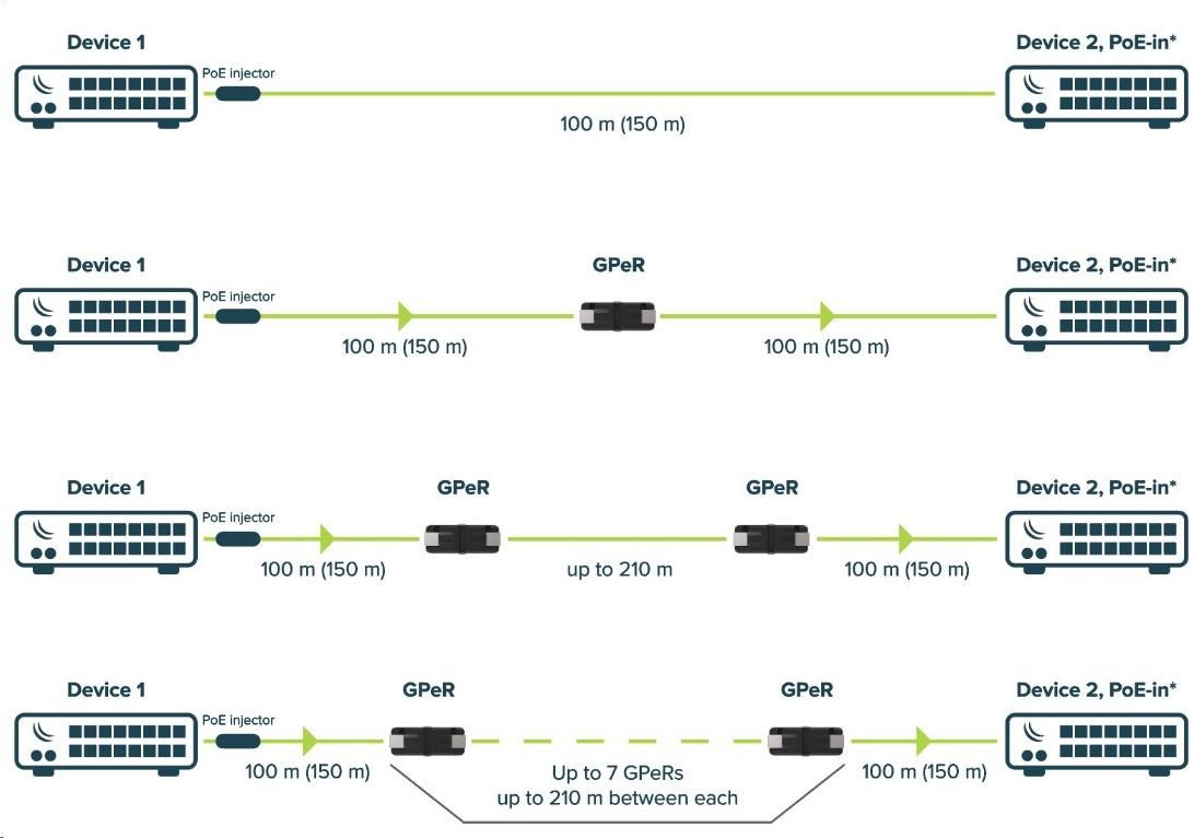 gPeR Gigabitový pasívny ethernetový opakovač umožňuje predĺžiť celkovú dĺžku kábla medzi začiatkom a koncom až na 1500 m! (pri použití 7 GPeR) Vhodné pre výškové budovy, viacbytové budovy s mnohými poschodiami a sekciami, kde by mohli byť veľmi dlhé ethernetové káble.