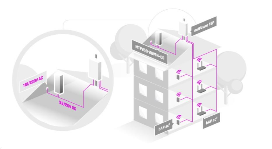 Vonkajší AC/DC zdroj v odolnom kovovom šasi s výstupným napätím 53 V, max. výstupný prúd 4.7 A, 250 W celkový výkon vhodný pre produktový rad netPower spoločnosti MikroTik. Šasi má certifikát IP67 s extra ochranou proti prachu a vlhkosti. Napájací zdroj je ukončený dvoma nezapojenými káblami - 3-žilovým vstupným káblom na striedavý prúd 230 V (100 - 240 V AC) a výstupným káblom na jednosmerný prúd.