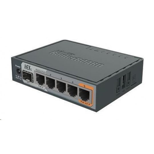..MikroTik RouterBOARD hEX S, 880MHz dvojjadrový CPU, 256MB RAM, 5x LAN, 1x SFP, PoE in/out, USB, microSD slot, vrátane. Licencia L4