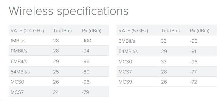 V porovnaní s rackovou verziou má táto 4 pevné všesmerové antény so ziskom 3dBi, o ktoré sa starajú 2 zabudované rádiové časti s modulačnými rýchlosťami 1733 Mb/s (5 GHz) a 300 Mb/s (2.4GHz).