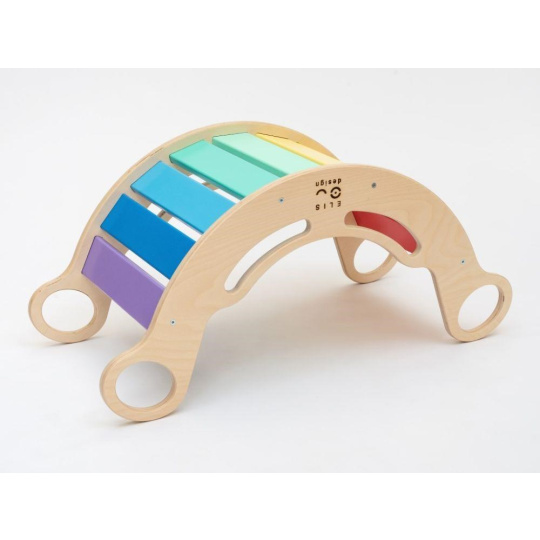 Veľmi kvalitná, bezpečná, hravá a vylepšená Montessori dúhová hojdačka 5v1 od ELIS DESIGN v úžasných sviežich, pestrých farbách, podporí správny motorický rozvoj vášho dieťaťa. Jej všestranné využitie umožní deťom používať hojdačku nielen na hojdanie, ale aj ako šmýkačku, úkryť, preliezačku alebo sedačku. Hojdačka (rainbow rocker) je vyrobená z tých najkvalitnejších materiálov, ručne dôkladne opracovaná a poctivo lakovaná farbami s atestom. Krásne farebná drevená hojdačka je vhodná pre deti od 1 do 6 rokov.