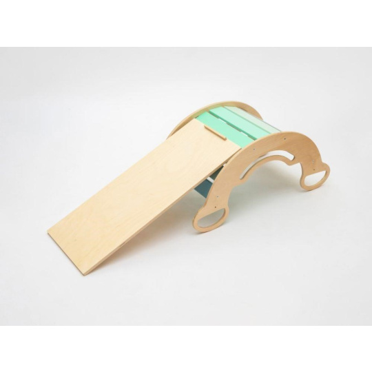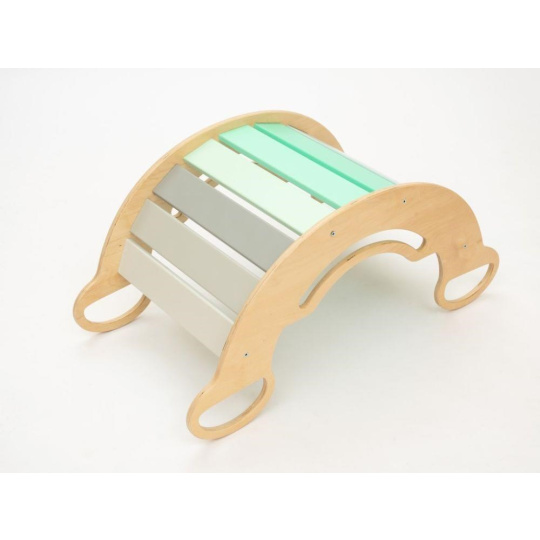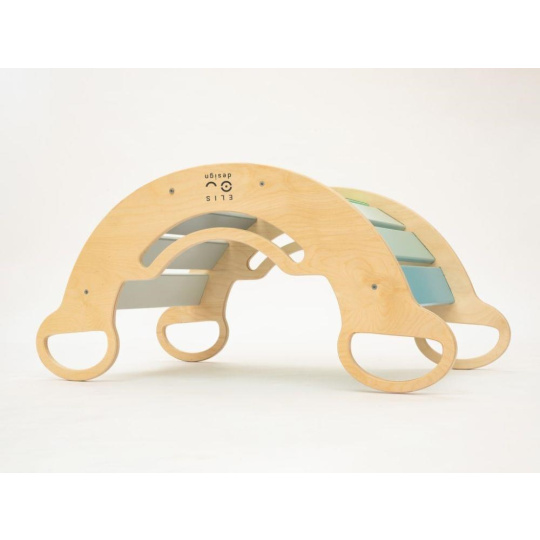 Detská drevená Montessori hojdačka smile 6in1, v príjemných pastelových farbách v modro-zelených tónoch v kombinácii s neutrálom šedou, vás prekvapí svojim dizajnom aj multifunkčnosťou. Hojdačka bude každý deň svojim širokým úsmevom lákať deti k príjemnému pohupovaniu aj k zábavnej hre. Jej využitie je všestranné, môže byť hojdačkou, skluzavkou, lezeckou dráhou, úkrytom i sedačkou, pri doplnení obojstrannou doskou aj detským nábytkom. Obojstranná doska nie je súčasťou hojdačky. Vyrobená je z tých najkvalitnejších materiálov, ručne hladko opracovaná a lakovaná farbami s atestom. Montessori hojdačka smile je širšia ako naše Montessori hojdačky 5in1, preto k tejto hojdačke ponúkame aj špeciálnu obojstrannú dosku, ktorá je doplnkom k hojdačkám smile. Vďaka doske ľahko premeníte hojdačku smile na detský stolček. Obojstranná doska nie je súčasťou hojdačky, pre využitie hojdačky ako nábytku je nevyhnutné dosku samostatne zakúpiť.