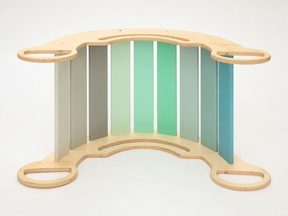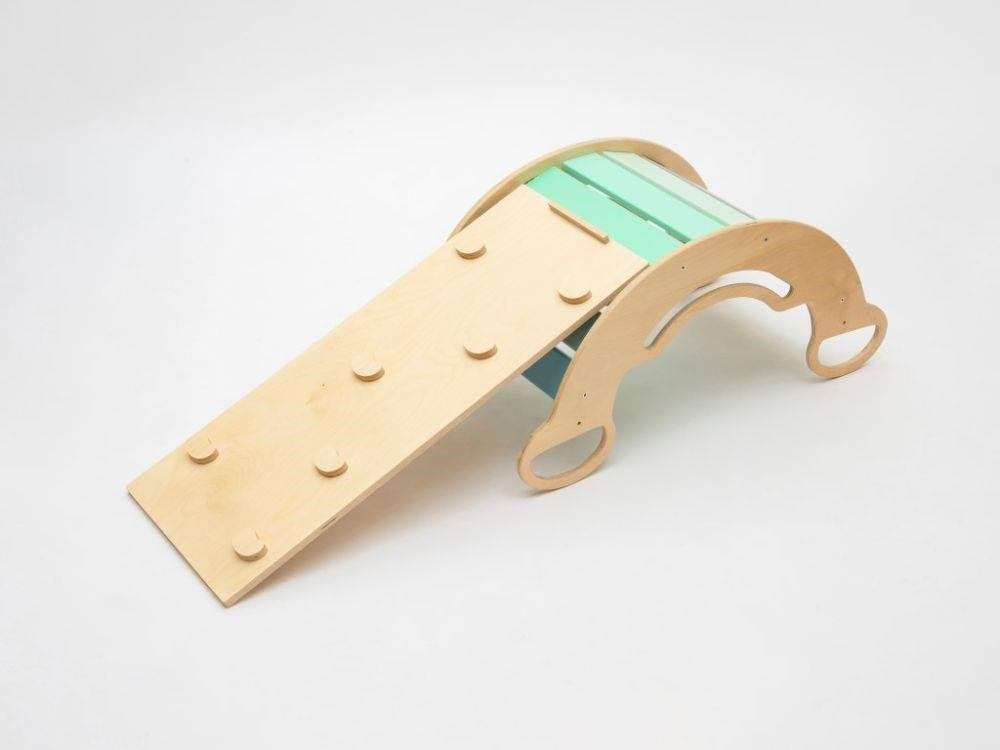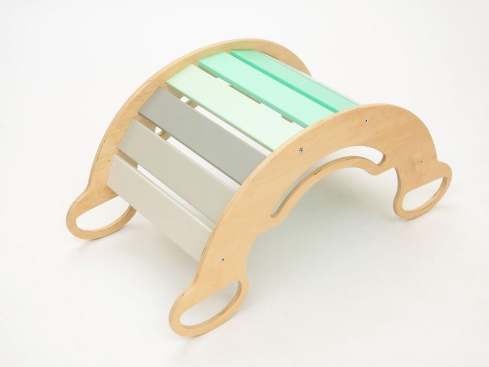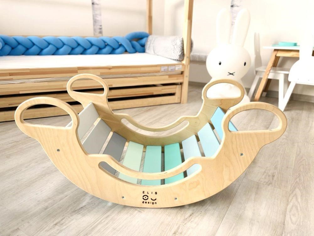Detská drevená Montessori hojdačka smile 6in1, v príjemných pastelových farbách v modro-zelených tónoch v kombinácii s neutrálom šedou, vás prekvapí svojim dizajnom aj multifunkčnosťou. Hojdačka bude každý deň svojim širokým úsmevom lákať deti k príjemnému pohupovaniu aj k zábavnej hre. Jej využitie je všestranné, môže byť hojdačkou, skluzavkou, lezeckou dráhou, úkrytom i sedačkou, pri doplnení obojstrannou doskou aj detským nábytkom. Obojstranná doska nie je súčasťou hojdačky. Vyrobená je z tých najkvalitnejších materiálov, ručne hladko opracovaná a lakovaná farbami s atestom. Montessori hojdačka smile je širšia ako naše Montessori hojdačky 5in1, preto k tejto hojdačke ponúkame aj špeciálnu obojstrannú dosku, ktorá je doplnkom k hojdačkám smile. Vďaka doske ľahko premeníte hojdačku smile na detský stolček. Obojstranná doska nie je súčasťou hojdačky, pre využitie hojdačky ako nábytku je nevyhnutné dosku samostatne zakúpiť.