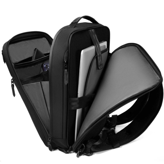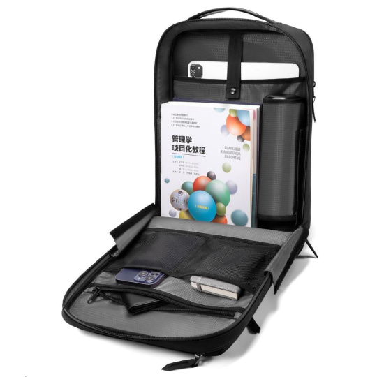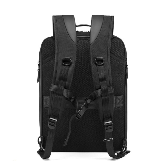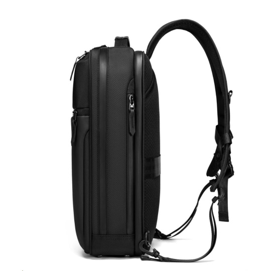 MYBALO ASTON Perfektní volba pro minimalisty s dobrým vkusem  6 ikon: - Nejtenčí batoh - Elegantní - Kapsa na notebook do 15,6" - Kapsa na tablet do 9" - Otevírání o 180 stupňů - USB a USB-C port - Drží tvar - Voděodolný - Skryté kapsy  Elegantní a minimalistický Jedná se o velmi elegantní a minimalistický batoh. S tímto parťákem neuděláte chybu při běžném nošení do města, ani na důležité schůzce.  Tenký batoh MYBALO Aston je batoh s vůbec nejmenší hloubkou z naší nabídky. Díky tomu působí elegantně a minimalisticky, ale i přesto se do něj vejdou všechny vaše nezbytnosti.  Kvalitní voděodolný materiál, dlouhá životnost Kvalitní umělá kůže zajišťuje trvanlivost a odolnost batohu proti vodě a opotřebení. MYBALO Aston tak bude vaším společníkem opravdu dlouho.  Drží tvar Batoh si zachovává svůj tvar také v případě, že jej budete mít úplně prázdný.  Vestavěný USB a USB-C port Nabíjejte svá elektronická zařízení kdekoli a kdykoli díky vestavěnému USB a USB-C portu.  Popruh k uchycení na kufr Cestujte pohodlně. Kdykoli chcete mít volná záda, jednoduše připevněte batoh na rukojeť svého kufru.  Pohodlné polstrování Užijte si komfortní nošení díky kvalitnímu a prodyšnému polstrování ramenních popruhů a zádové části.  Další praktické kapsy Zorganizujte si pohodlně a snadno své věci díky množství vychytaných kapes.  Skryté kapsy V zádové části a na ramenním popruhu najdete skryté kapsy pro bezpečné uložení cenností.  Vnitřní kapsy Vnitřní kapsy slouží pro snadnou organizaci všech vašich věcí.  Přední kapsa Přední kapsa je určena pro věci, které chcete mít rychle a snadno po ruce.  Parametry: - Rozměry: 46 x 30 x 9 cm - Objem: 11 l - Hmotnost: 1,19 kg - Kapsa na notebook: Ano (do vel. 15,6") - Kapsa na tablet: Ano (do vel. 9") - USB port: Ano - Voděodolnost: Ano - Hlavní materiál: Ekokůže + Polyester - Podšívka: Polyester - Barva: Černá