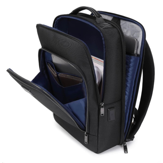 MYBALO ASTON Perfektní volba pro minimalisty s dobrým vkusem 6 ikon: - Nejtenčí batoh - Elegantní - Kapsa na notebook do 15,6" - Kapsa na tablet do 9" - Otevírání o 180 stupňů - USB a USB-C port - Drží tvar - Voděodolný - Skryté kapsy Elegantní a minimalistický Jedná se o velmi elegantní a minimalistický batoh. S tímto parťákem neuděláte chybu při běžném nošení do města, ani na důležité schůzce. Tenký batoh MYBALO Aston je batoh s vůbec nejmenší hloubkou z naší nabídky. Díky tomu působí elegantně a minimalisticky, ale i přesto se do něj vejdou všechny vaše nezbytnosti. Kvalitní voděodolný materiál, dlouhá životnost Kvalitní umělá kůže zajišťuje trvanlivost a odolnost batohu proti vodě a opotřebení. MYBALO Aston tak bude vaším společníkem opravdu dlouho. Drží tvar Batoh si zachovává svůj tvar také v případě, že jej budete mít úplně prázdný. Vestavěný USB a USB-C port Nabíjejte svá elektronická zařízení kdekoli a kdykoli díky vestavěnému USB a USB-C portu. Popruh k uchycení na kufr Cestujte pohodlně. Kdykoli chcete mít volná záda, jednoduše připevněte batoh na rukojeť svého kufru. Pohodlné polstrování Užijte si komfortní nošení díky kvalitnímu a prodyšnému polstrování ramenních popruhů a zádové části. Další praktické kapsy Zorganizujte si pohodlně a snadno své věci díky množství vychytaných kapes. Skryté kapsy V zádové části a na ramenním popruhu najdete skryté kapsy pro bezpečné uložení cenností. Vnitřní kapsy Vnitřní kapsy slouží pro snadnou organizaci všech vašich věcí. Přední kapsa Přední kapsa je určena pro věci, které chcete mít rychle a snadno po ruce. Parametry: - Rozměry: 46 x 30 x 9 cm - Objem: 11 l - Hmotnost: 1,19 kg - Kapsa na notebook: Ano (do vel. 15,6") - Kapsa na tablet: Ano (do vel. 9") - USB port: Ano - Voděodolnost: Ano - Hlavní materiál: Ekokůže + Polyester - Podšívka: Polyester - Barva: Černá
