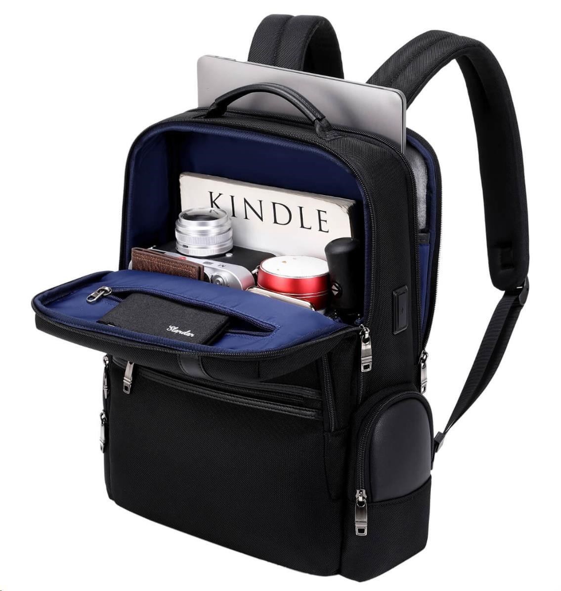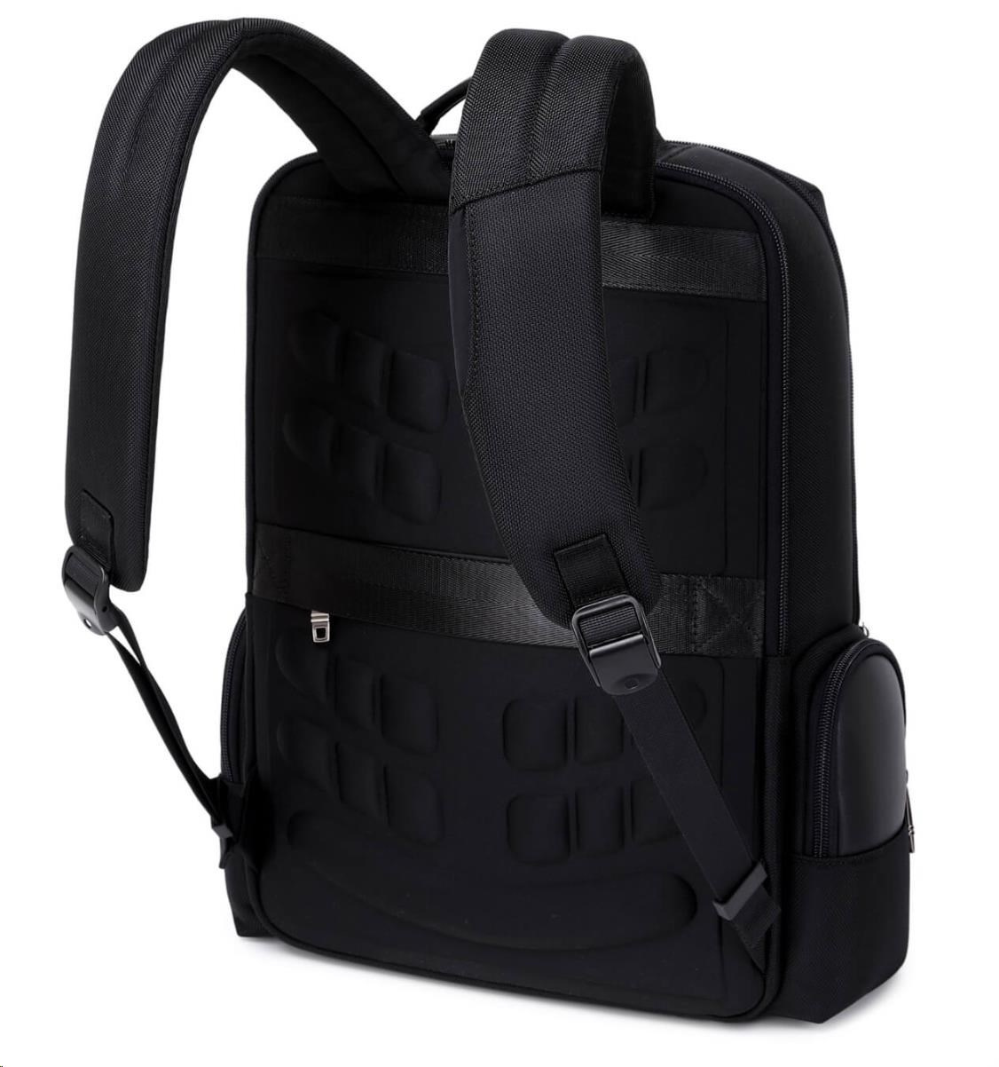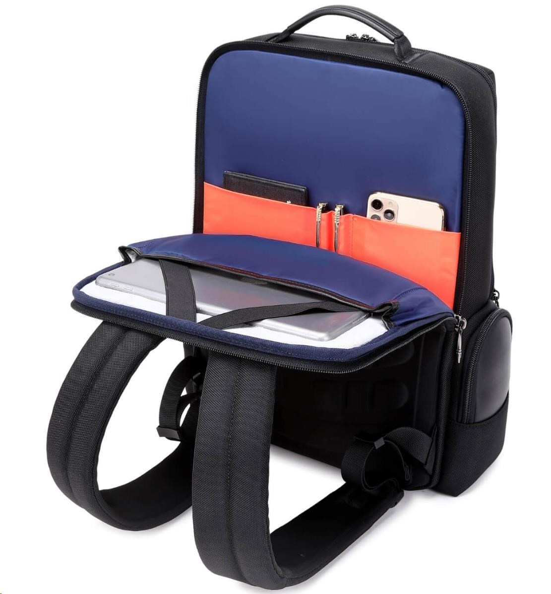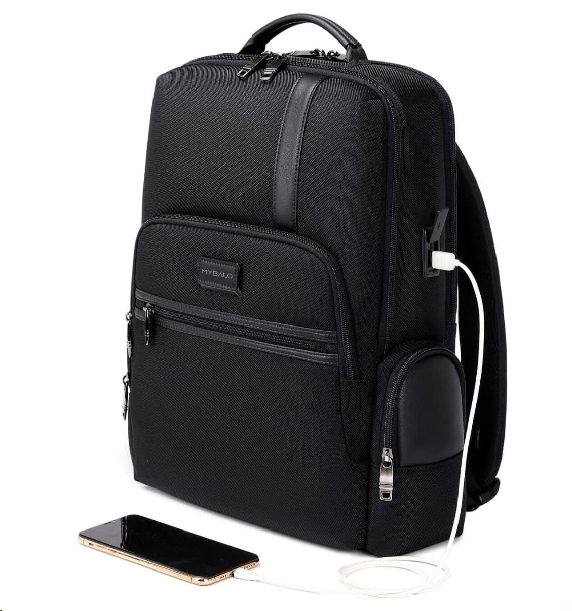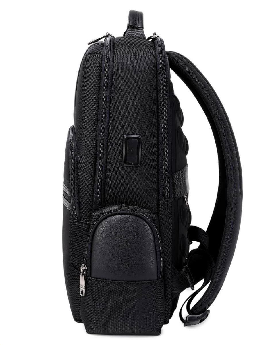 MYBALO ASTON Perfektní volba pro minimalisty s dobrým vkusem  6 ikon: - Nejtenčí batoh - Elegantní - Kapsa na notebook do 15,6" - Kapsa na tablet do 9" - Otevírání o 180 stupňů - USB a USB-C port - Drží tvar - Voděodolný - Skryté kapsy  Elegantní a minimalistický Jedná se o velmi elegantní a minimalistický batoh. S tímto parťákem neuděláte chybu při běžném nošení do města, ani na důležité schůzce.  Tenký batoh MYBALO Aston je batoh s vůbec nejmenší hloubkou z naší nabídky. Díky tomu působí elegantně a minimalisticky, ale i přesto se do něj vejdou všechny vaše nezbytnosti.  Kvalitní voděodolný materiál, dlouhá životnost Kvalitní umělá kůže zajišťuje trvanlivost a odolnost batohu proti vodě a opotřebení. MYBALO Aston tak bude vaším společníkem opravdu dlouho.  Drží tvar Batoh si zachovává svůj tvar také v případě, že jej budete mít úplně prázdný.  Vestavěný USB a USB-C port Nabíjejte svá elektronická zařízení kdekoli a kdykoli díky vestavěnému USB a USB-C portu.  Popruh k uchycení na kufr Cestujte pohodlně. Kdykoli chcete mít volná záda, jednoduše připevněte batoh na rukojeť svého kufru.  Pohodlné polstrování Užijte si komfortní nošení díky kvalitnímu a prodyšnému polstrování ramenních popruhů a zádové části.  Další praktické kapsy Zorganizujte si pohodlně a snadno své věci díky množství vychytaných kapes.  Skryté kapsy V zádové části a na ramenním popruhu najdete skryté kapsy pro bezpečné uložení cenností.  Vnitřní kapsy Vnitřní kapsy slouží pro snadnou organizaci všech vašich věcí.  Přední kapsa Přední kapsa je určena pro věci, které chcete mít rychle a snadno po ruce.  Parametry: - Rozměry: 46 x 30 x 9 cm - Objem: 11 l - Hmotnost: 1,19 kg - Kapsa na notebook: Ano (do vel. 15,6") - Kapsa na tablet: Ano (do vel. 9") - USB port: Ano - Voděodolnost: Ano - Hlavní materiál: Ekokůže + Polyester - Podšívka: Polyester - Barva: Černá