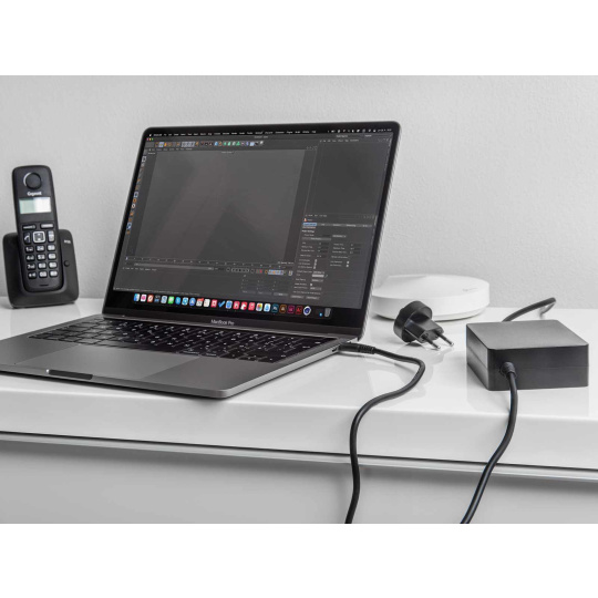Súčasťou balenia je 1,2 m dlhý napájací kábel a zástrčka - cestovná redukcia na pripojenie nabíjacieho adaptéra priamo do elektrickej zásuvky.