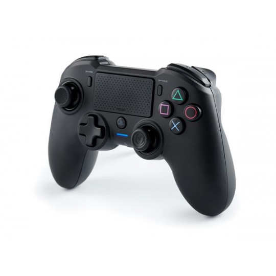 Asymetrický bezdrôtový ovládač Nacon určený pre všetkých majiteľov hernej konzoly PlayStation 4 zaujme nielen asymetricky umiestnenými páčkami, ale aj väčšími spúšťami, väčšími akčnými a zadnými tlačidlami, elegantným lesklým vnútorným okrajom okolo páčok a textúrovaným povrchom umožňujúcim pohodlnejšie uchopenie. Bezdrôtovú prevádzku až do vzdialenosti sedem metrov od konzoly zabezpečuje Bluetooth® a na jedno nabitie môžete hrať až sedem hodín a následne môžete ovládač dobíjať pomocou priloženého micro-USB kábla.