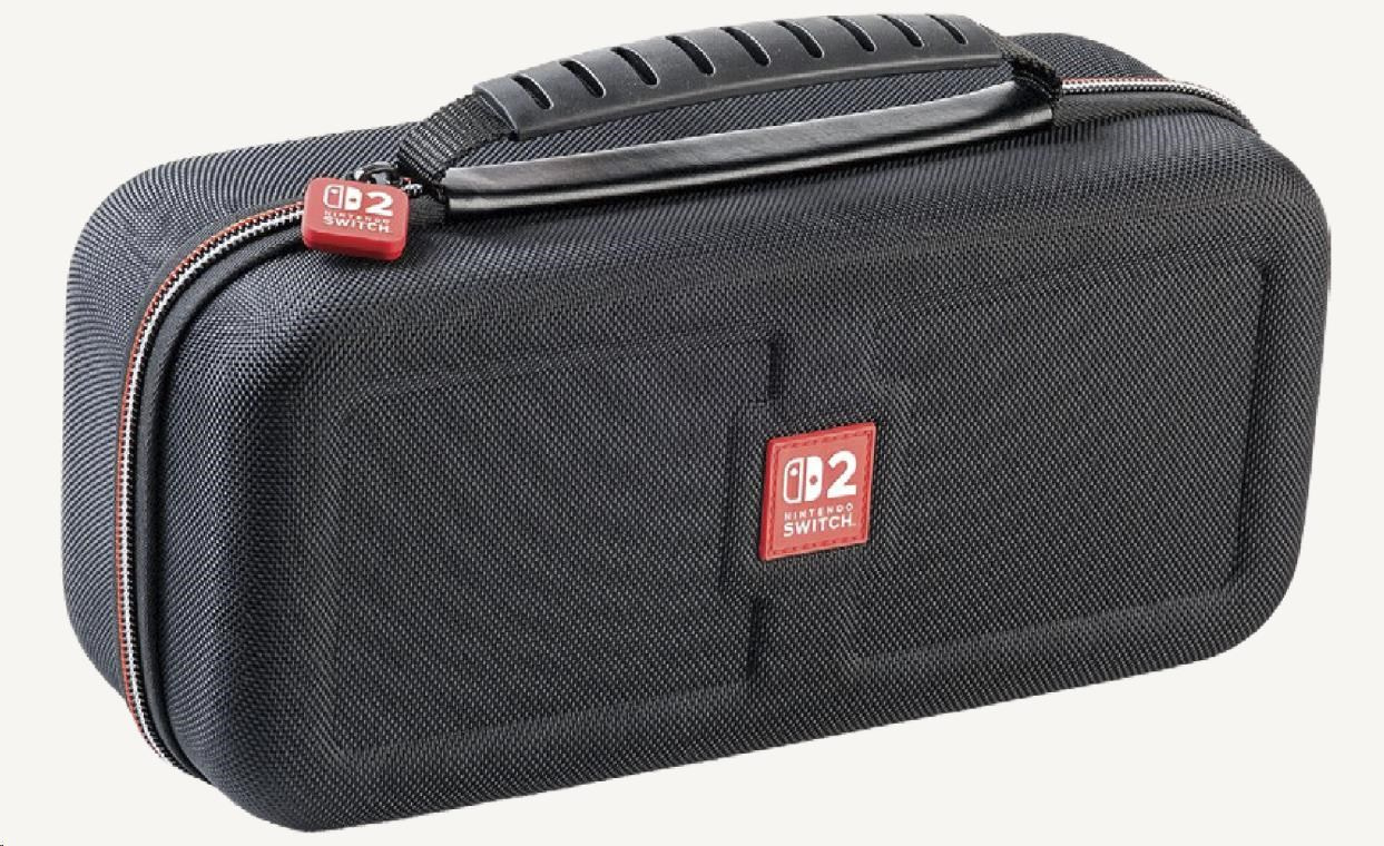 Toto väčšie prepravné puzdro od spoločnosti Nacon oceníte, ak budete chcieť bezpečne a pohodlne prenášať svoju hernú konzolu Nintendo Switch 2 vrátane jej základného príslušenstva. Puzdro pojme nielen samotnú konzolu, ale podľa potreby aj dokovaciu stanicu, nový ovládač Pro Controller alebo držiak Joy-Con 2 Charging Grip. Zároveň ponúka tiež samostatnú priehradku pre napájací adaptér s káblom a prepojovací HDMI kábel. Nastaviteľný stojan v hornej časti puzdra, pri hraní umožňujúci pohodlnejšie sledovanie diania na obrazovke, ochráni počas prepravy ako obrazovku, tak aj analógové páčky konzoly a na jeho vnútornej strane navyše nájdete dvanásť kapsičiek na uloženie herných kariet. Súčasťou balenia sú aj dve menšie plastové puzdrá na microSD karty a čistiaci handričku s logom Nintendo Switch 2. Puzdro je kompatibilné tiež s konzolami Switch a Switch – OLED Model, vrátane ich príslušenstva.