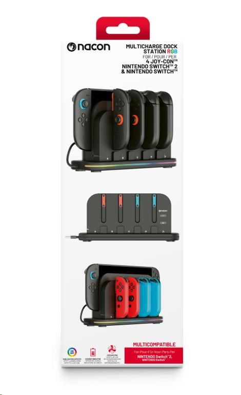 Táto nabíjacia dokovacia stanica od spoločnosti Nacon príde vhod všetkým majiteľom novej hernej konzoly Nintendo Switch 2 aj pôvodnej hernej konzoly Nintendo Switch, ktorí často potrebujú nabíjať väčší počet ovládačov Joy-Con. Stanica umožňuje nabíjať súčasne až štyri ovládače, ako aj samotnú konzolu, ktorej zabraňuje prehriatiu zabudovaný chladicí vetrák. O stave nabíjania každého z ovládačov informuje príslušný LED ukazovateľ, zatiaľ čo RGB pásik s výberom z deviatich rôznych efektov dodáva stanici štýlový, moderný vzhľad. Pretože napájací USB-C kábel nie je súčasťou balenia, slúži na pripojenie stanice do elektrickej siete originálne napájacie príslušenstvo dodávané s konzolou.