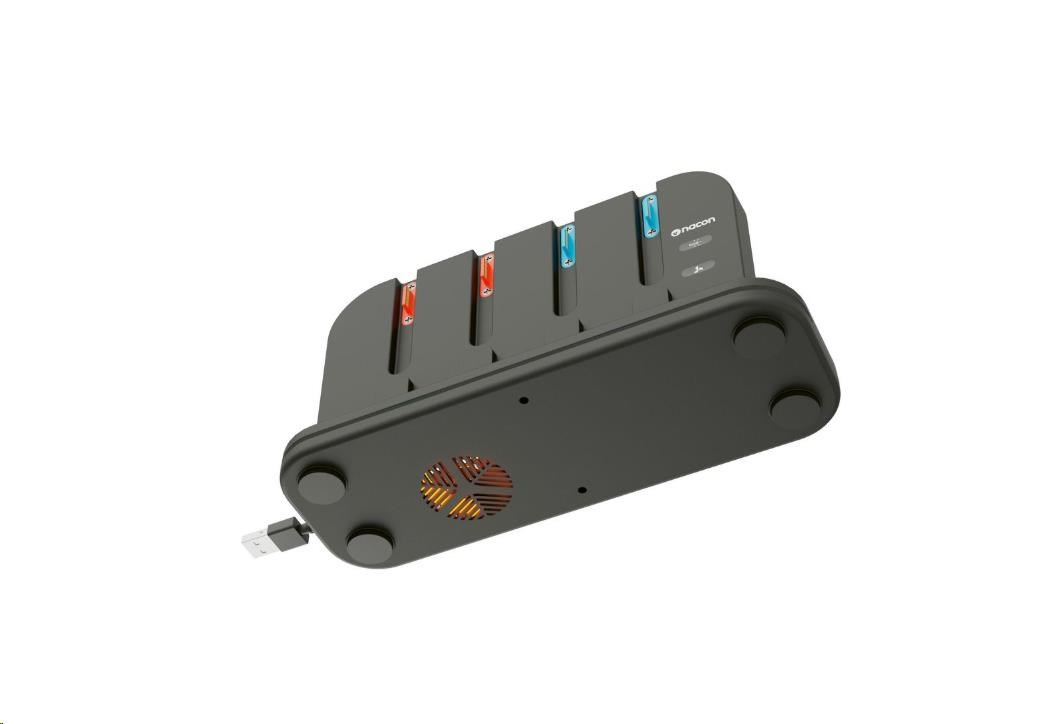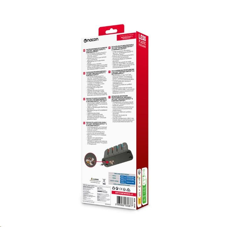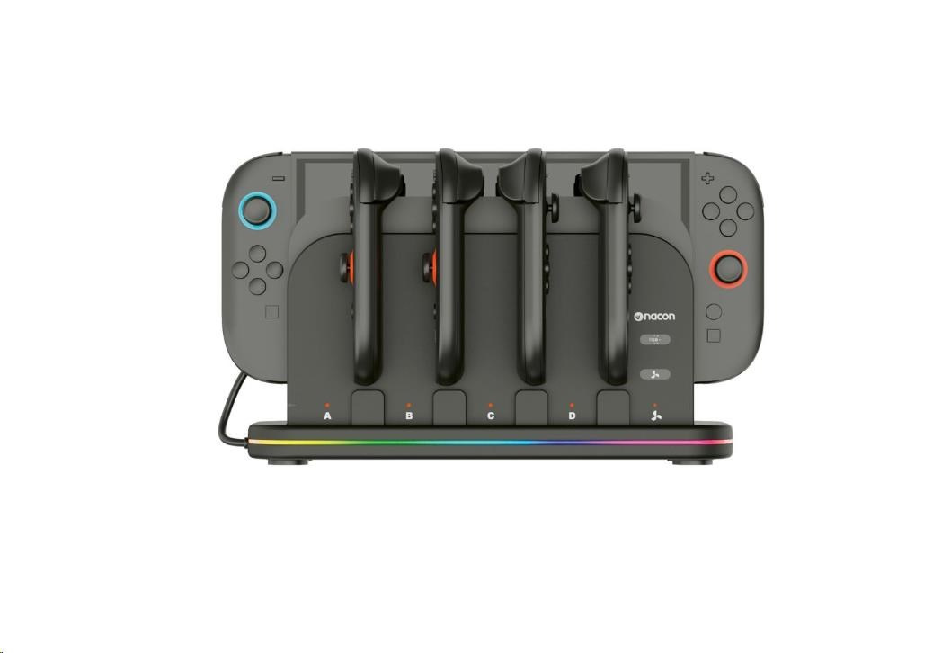 Tato nabíjacía dokovacia stanica od spoločnosti Nacon príde vhod všetkým majiteľom novej hernej konzoly Nintendo Switch 2 aj pôvodnej hernej konzoly Nintendo Switch, ktorí často potrebujú nabíjať väčší počet ovládačov Joy-Con. Stanica umožňuje nabíjať súčasne až štyri ovládače, ako aj samotnú konzolu, jejmuž prehriatiu zabraňuje zabudovaný chladený ventilátor. O stave nabíjania každého z ovládačov informuje príslušný LED ukazovateľ, zatiaľ čo RGB pruh s výberom z deviatich rôznych efektov dodáva stanici štýlový, moderný vzhľad. Pretože napájací USB-C kábel nie je súčasťou balenia, slúži na pripojenie stanice do elektrickej siete originálne napájacie príslušenstvo dodávané s konzolou.