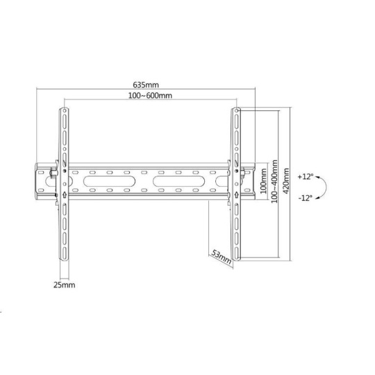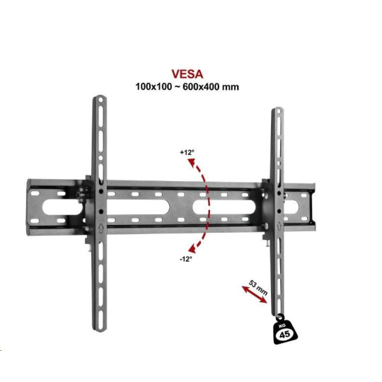 Držiak na televízory a displeje Fiber Novelty FN45T Držiak na televízory a displeje 37" - 75", nakláňanie +12° / -12°, vzdialenosť od steny 53mm, aretácia proti vysadenia, VESA štandardy 100x100 až 600x400, nosnosť 45kg Nakláňací držiak na televízory a displeje Fiber Novelty FN45T Kvalitný nástenný držiak ideálny pre bezpečné zavesenie televízorov alebo displejov s uhlopriečkou 37" až 75". Držiak umožňuje jednoduché nakláňanie obrazovky pod uhlom od +12° až do -12°, potrebný uhol náklonu ľahko zaaretuje. Vzdialenosť obrazovky od steny 53mm, zabezpečenie proti vysadeniu, rozmery základovej dosky 635x100mm, materiál kov. Držiak podporuje VESA štandardy od 100x100 do 600x400mm, nosnosť 45kg. Balenie obsahuje inštalačný materiál. Záruka na držiak 5 rokov. Technické údaje: nosnosť 45 kg na televízory, displeje a monitory s uhlopriečkou 37" - 75" podporuje VESA štandardy 100x100 až 600x400 možnosť nakláňania +12° / -12° zabezpečenie obrazovky v požadovanom náklone vzdialenosť od steny 53mm aretačný mechanizmus proti vysadeniu rozmer základovej dosky 635 x 100 mm balenie obsahuje inštalačný materiál materiál kov farebné prevedenie čierne záruka 5 rokov