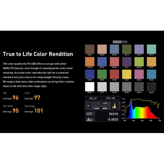 - Presný a veľmi farebný výkon podobný pokročilým svetlám Nanlite