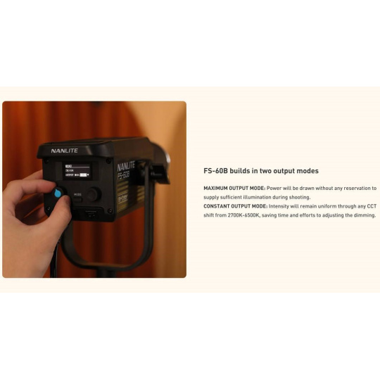 Svetlo FS-60B sa používa jednoducho pomocou dvoch vstavaných tlačidiel na stmievanie od 0 do 100 % a reguláciu teploty farieb. Môžete nastaviť chladnejšie tóny bielej až po teplejšie tóny a čokoľvek medzi tým, a nájsť tak správnu mieru osvetlenia pre vašu konkrétnu scénu. Svetlo má tiež jedno tlačidlo a 1,3" OLED displej pre intuitívne nastavovanie. Okrem jednoduchého ovládania obsahuje model FS-60B vstavaný ventilátor, ktorý neruší zvukové nahrávky, a keď je potrebná absolútna ticho, ho možno vypnúť.