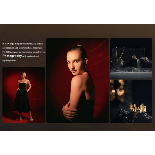 Svetlo FS-60B je ultra kompaktné a dodáva sa s bajonetom FM (rovnako ako svetlo Forza 60) pre veľké množstvo nástrojov na modelovanie svetla spoločnosti Nanlite, ako sú Fresnelové šošovky, softboxy a dáždniky, aby ste mohli svetlo zmäkčiť a modelovať. Súčasťou dodávky je tiež adaptér bajonetu Bowens, ktorý zabezpečuje širšiu kompatibilitu s radom modifikátorov svetla. Do držiaka a adaptéra Bowens sú navyše tiež zabudované držiaky dážnikov, čo poskytuje ešte ďalšie možnosti zmäkčenia svetla.