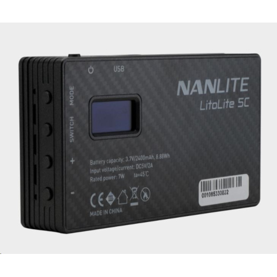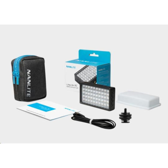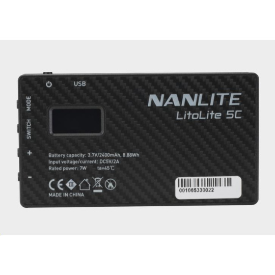 LitoLite 5C je kompaktný LED svetelný panel so zabudovanou Li-Ion batériou, USB-C nabíjaním, úžasným jasom, nastaviteľnou teplotou farieb od 2700K do 7500K s farebným posunom zo zelenej na purpurovú, 360° reguláciou odtieňa so 100 úrovňami nastavenia sýtosti farieb a 15 predprogramovanými, nastaviteľnými špeciálnymi svetelnými efektmi.