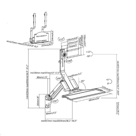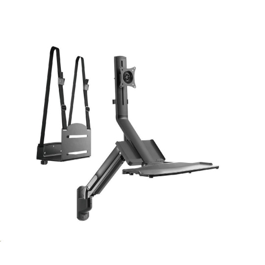 Nástenná pracovná stanica monitor, klávesnica, PC Fiber Mounts M8C38 Kompletná pracovná stanica, držák monitora 17-32", klávesnice a PC Toweru Kvalitný nástenný systém pre vytvorenie pracovnej alebo informačnej stanice - 3D polohovateľný držiak na monitory 17-32" vrátane poličky na klávesnicu aj s myšou + univerzálny nástenný držiak na PC Tower. Plná polohovateľnosť držiaka monitora s policou - otáčanie, náklon, výškové polohovanie, rotácia monitoru, korekcia roviny, možnosť zaklopenia police. Police na klávesnicu (a myš) má rozmer 660 x 220mm, možnosť naklonenia alebo zaklopenia. Na držiaku je aj priehradka na vizitky, katalógy apod. Nástenný držiak na PC Tower má nosnosť 15kg. Farebné prevedenie čierne. Záruka 3 roky. Plnohodnotná nástenná pracovná stanica na monitor, klávesnicu s myšou a PC Tower, plne polohovateľné, TOP kvalita - Fiber Mounts M8C38 Technické údaje: maximálna hmotnosť monitora 9kg maximálna hmotnosť PC Toweru 15kg veľkosť monitora 17" až 32" držiak monitora podporuje VESA 75x75 a 100x100 kompletná polohovateľnosť držiaka monitora s poličkou otáčanie do strán, náklon, nastavenie výšky a vzdialenosti od steny výškové polohovanie až o 515mm funkcia pivot držiaka monitora polica na klávesnicu o rozmeroch 660x220mm možnosť náklonu až 5°, možnosť zaklopenia k monitoru nástenný držiak na PC Tower vrátane pásov inštalačný materiál systém vedenia káblov farebné prevedenie čierne záruka 3 roky