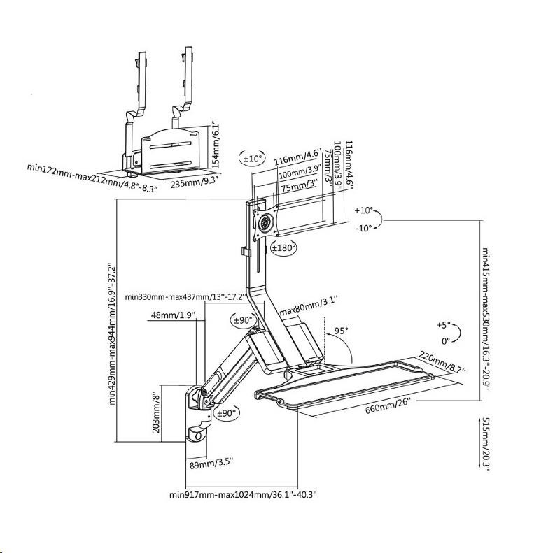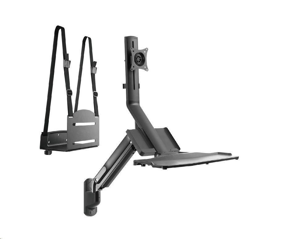 Nástenná pracovná stanica monitor, klávesnica, PC Fiber Mounts M8C38 Kompletná pracovná stanica, držák monitora 17-32", klávesnice a PC Toweru Kvalitný nástenný systém pre vytvorenie pracovnej alebo informačnej stanice - 3D polohovateľný držiak na monitory 17-32" vrátane poličky na klávesnicu aj s myšou + univerzálny nástenný držiak na PC Tower. Plná polohovateľnosť držiaka monitora s policou - otáčanie, náklon, výškové polohovanie, rotácia monitoru, korekcia roviny, možnosť zaklopenia police. Police na klávesnicu (a myš) má rozmer 660 x 220mm, možnosť naklonenia alebo zaklopenia. Na držiaku je aj priehradka na vizitky, katalógy apod. Nástenný držiak na PC Tower má nosnosť 15kg. Farebné prevedenie čierne. Záruka 3 roky. Plnohodnotná nástenná pracovná stanica na monitor, klávesnicu s myšou a PC Tower, plne polohovateľné, TOP kvalita - Fiber Mounts M8C38 Technické údaje: maximálna hmotnosť monitora 9kg maximálna hmotnosť PC Toweru 15kg veľkosť monitora 17" až 32" držiak monitora podporuje VESA 75x75 a 100x100 kompletná polohovateľnosť držiaka monitora s poličkou otáčanie do strán, náklon, nastavenie výšky a vzdialenosti od steny výškové polohovanie až o 515mm funkcia pivot držiaka monitora polica na klávesnicu o rozmeroch 660x220mm možnosť náklonu až 5°, možnosť zaklopenia k monitoru nástenný držiak na PC Tower vrátane pásov inštalačný materiál systém vedenia káblov farebné prevedenie čierne záruka 3 roky