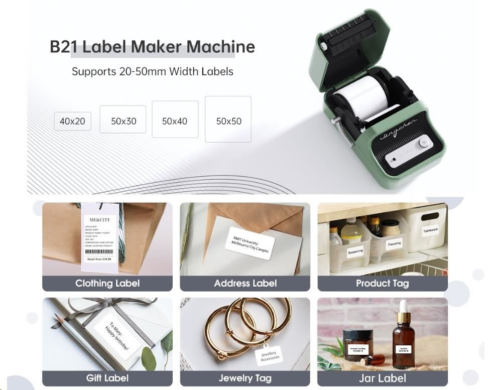 Zapomeňte na zdĺhavé a komplikované procesy tlače štítkov. S NIIMBOT B21S je tlač štítkov hračkou vďaka jej bezdrôtovej technológii a vynikajúcim funkciám. Táto prenosná tlačiareň štítkov je vybavená dobíjateľnou lítiovou batériou, ktorá vám umožní tlačiť kdekoľvek a kedykoľvek budete potrebovať po dobu 4 až 5 hodín. S NIIMBOT B21S môžete jednoducho označovať veci v kancelárii, škole, obchode a na mnoho ďalších miestach. Jej kompatibilita s PC a so systémami Android a iOS znamená, že môžete tlačiť priamo zo svojho smartfónu alebo tabletu, čo zabezpečuje maximálne pohodlie a efektivitu.