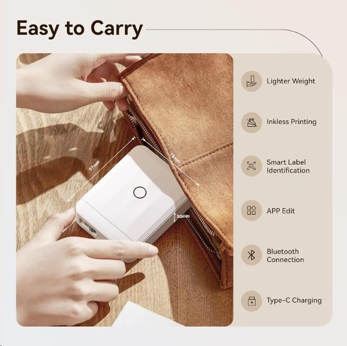 Ponúka širokú škálu možností tlače. Môžete tlačiť vertikálne aj horizontálne, vytvárať čiarové kódy a sériové čísla, čo vám umožňuje prispôsobiť štítky presne podľa svojich potrieb. S rozlíšením 203 dpi, maximálnou šírkou tlače 12 mm a kompatibilitou s 12-15mm štítkami, si vyrobíte polepky a štítky v tej najvyššej kvalite. To všetko v minimálnych rozmeroch. Tlačiareň si môžete vziať kamkoľvek a ani o nej nebudete vedieť. Tlačí