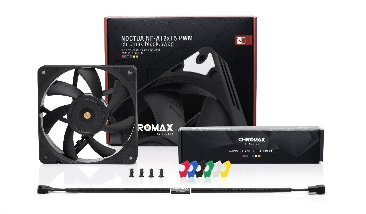 Rad NF-A12x15 si vyslúžila popredné miesto pri výbere 120mm ventilátorov množstvom ocenení a odporúčaní od technických časopisov a stránok po celom svete. NF-12x15 PWM chromax.black.swap kombinuje tichý chod tejto rady a elegantný celokovový čierny dizajn rady chromax.black. Balenie obsahuje aj sadu protivibračných podložiek pre tých, ktorí radi svoj stroj farebne zladia. Kvalitu chodu a spokojnosť tiež zabezpečí SSO2 ložisko, viac ako 150000 hodín MTTF a 6 rokov záruky u výrobcu.