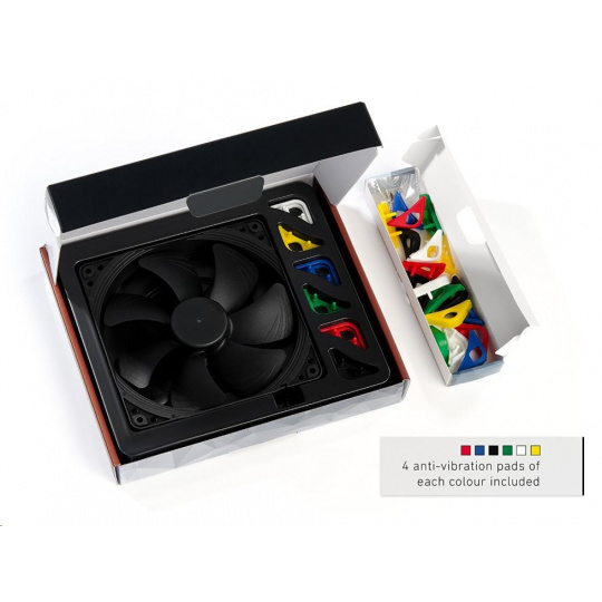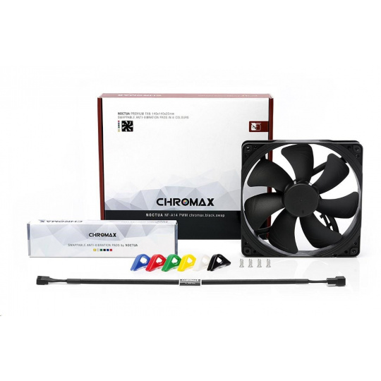 ventilátor, rozmer 140x140x25mm, max. hlučnosť 24.6dBA, prietok 140.2m3/h, 300 až 1500 otáčok, 4pin PWM, ložisko SSO2, edícia Chromax - vymeniteľné farebné antivibračné podložky