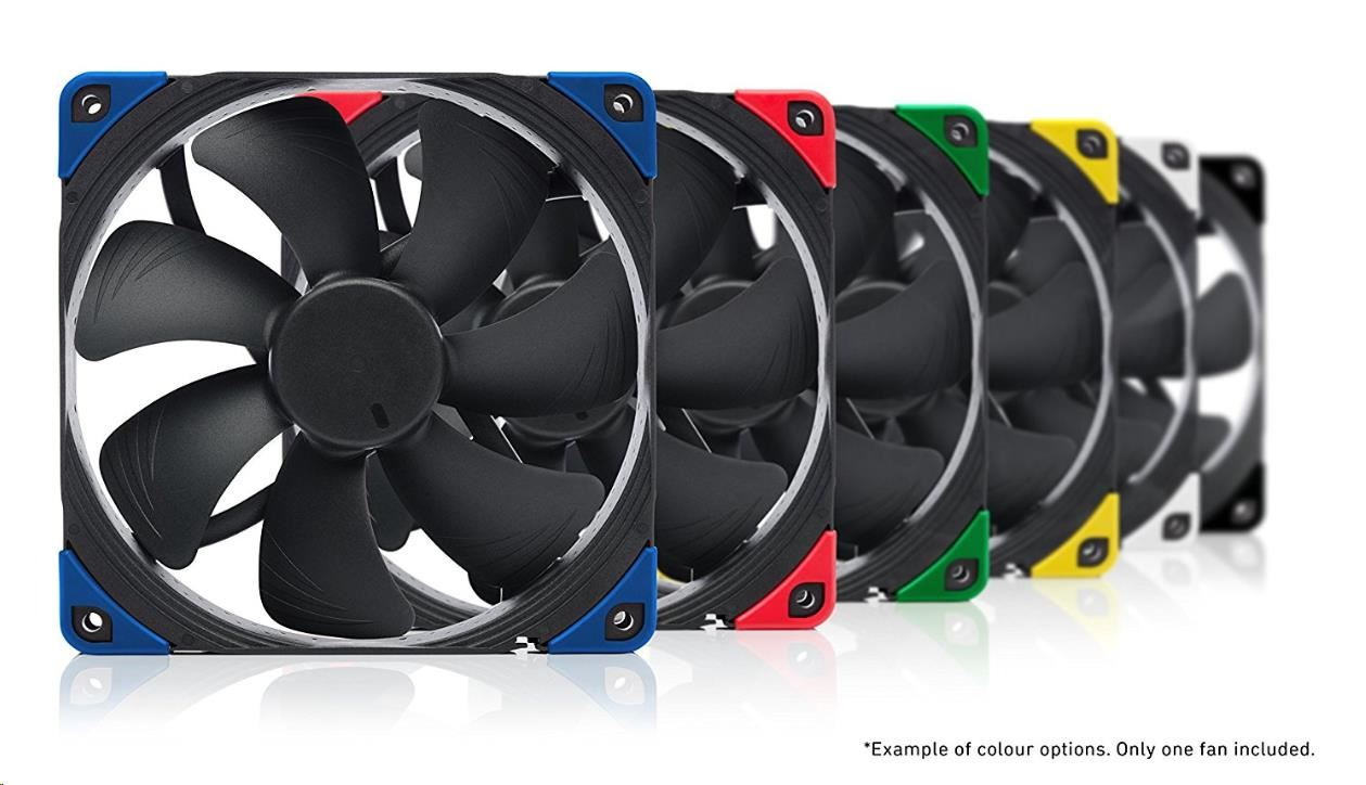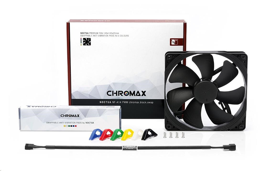 ventilátor, rozmer 140x140x25mm, max. hlučnosť 24.6dBA, prietok 140.2m3/h, 300 až 1500 otáčok, 4pin PWM, ložisko SSO2, edícia Chromax - vymeniteľné farebné antivibračné podložky