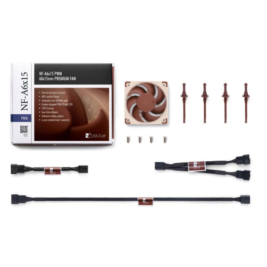 NF-A6x15 je vysoko optimalizovaný tichý ventilátor prémiovej kvality o rozmeroch 60x15 mm, ktorý je vybavený pokročilými aerodynamickými konštrukčnými opatreniami, ako sú Flow Acceleration Channels a rám Noctua AAO. Verzia s PWM využíva špeciálne navrhnutý integrovaný obvod NE-FD1 spoločnosti Noctua pre plne automatickú reguláciu otáčok prostredníctvom 4pinových záhlaví ventilátora a dodáva sa s adaptérom Low-Noise Adaptor pre zníženie maximálnych otáčok pri PWM regulácii z 3500 na 3050 ot./min. Jeho vynikajúca plynulosť chodu, ložisko SSO2 a dôveryhodná prémiová kvalita spoločnosti Noctua z neho robia elitu pre najvyššie nároky.