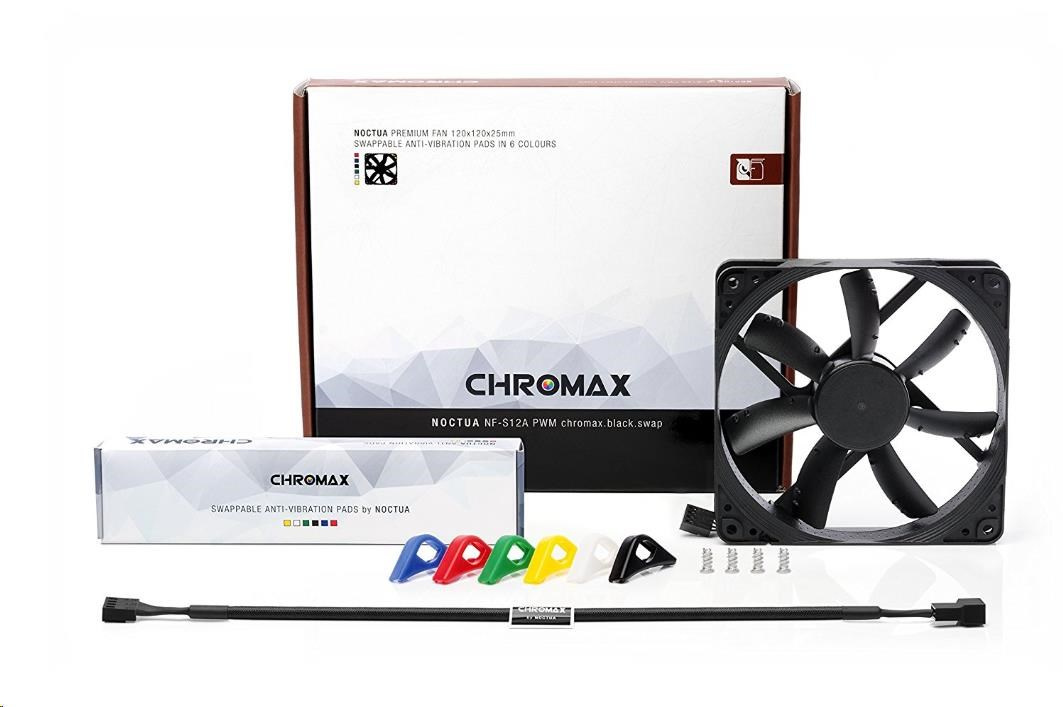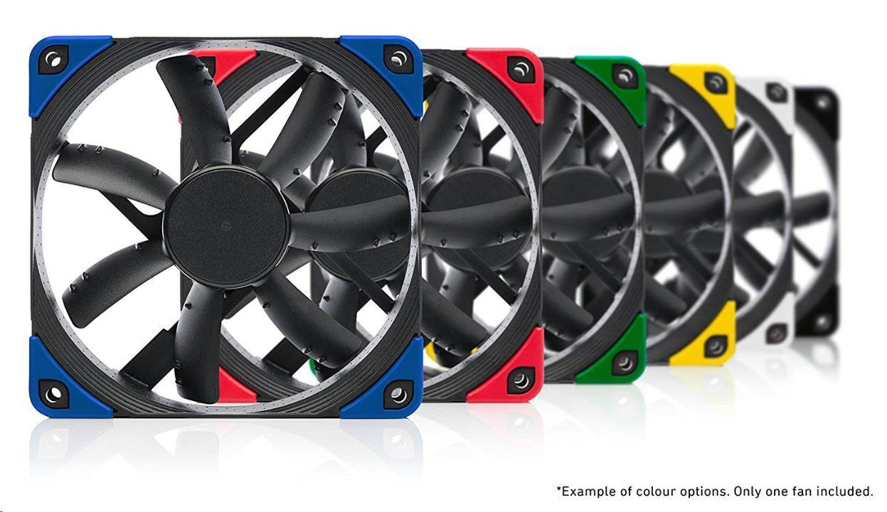 ventilátor, ultratichý, rozmery 120x120x25mm, hlučnosť 17.8dB, prietok 107.5 m3/h, 300 až 1200 otáčok, optimalizovaná geometria a povrch lopatiek, SSO2, edícia Chromax - vymeniteľné farebné antivibračné podložky